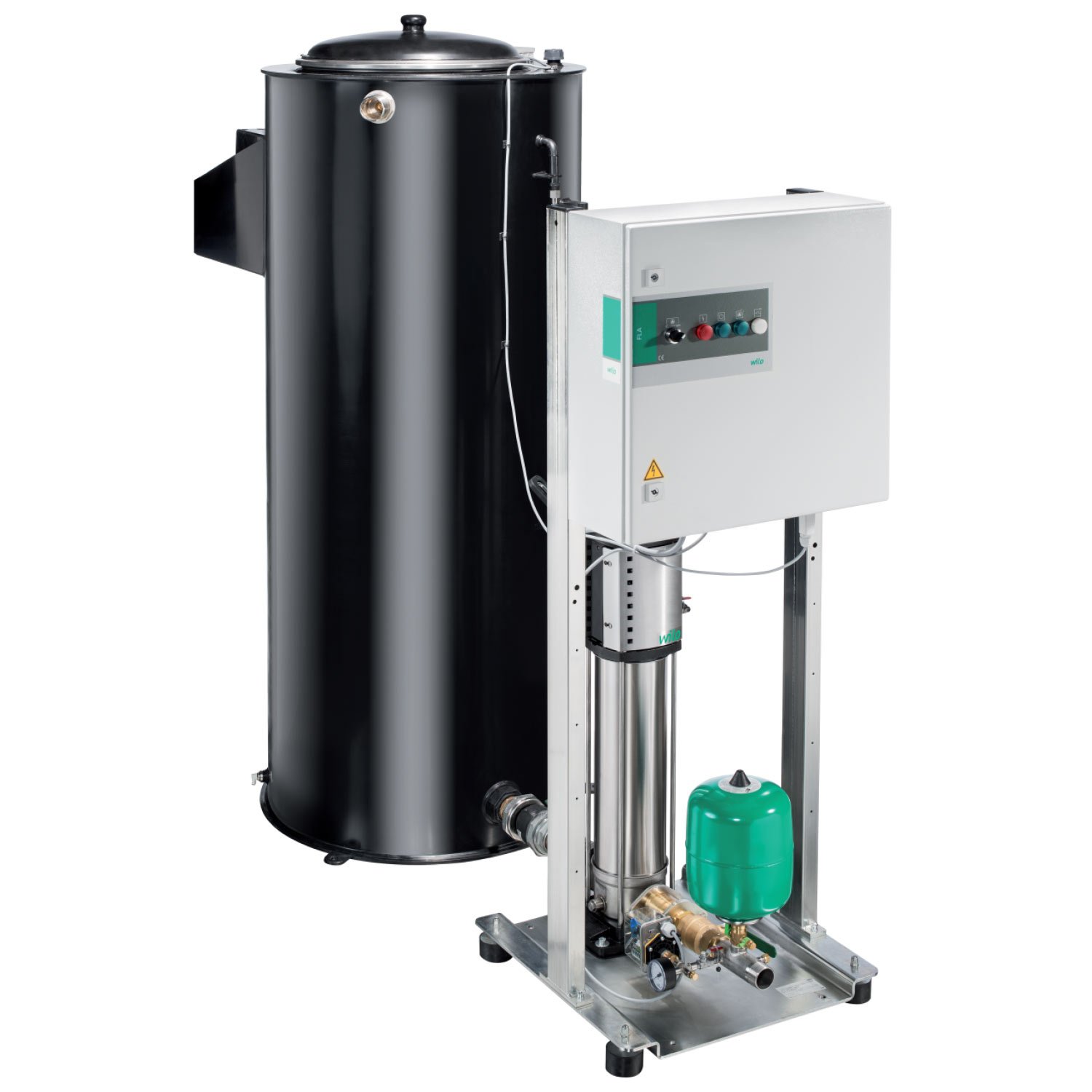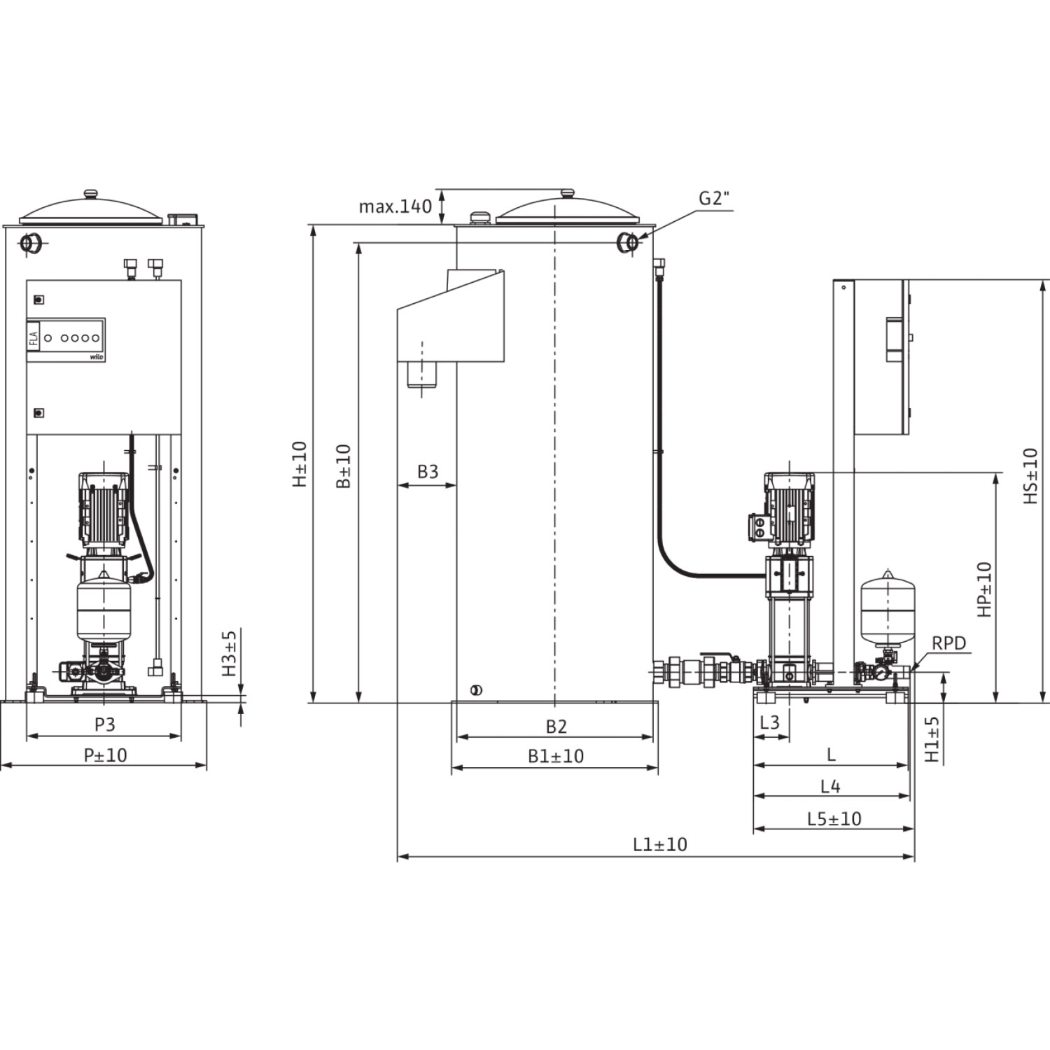 | Тип Установка повышения давления для подачи воды для пожаротушения в соответствии с DIN 14462, для опосредованного подключения. С вертикальными многоступенчатым высоконапорным центробежным насосом из нержавеющей стали с сухим ротором и приемным резервуаром. | ||||||||||||||||